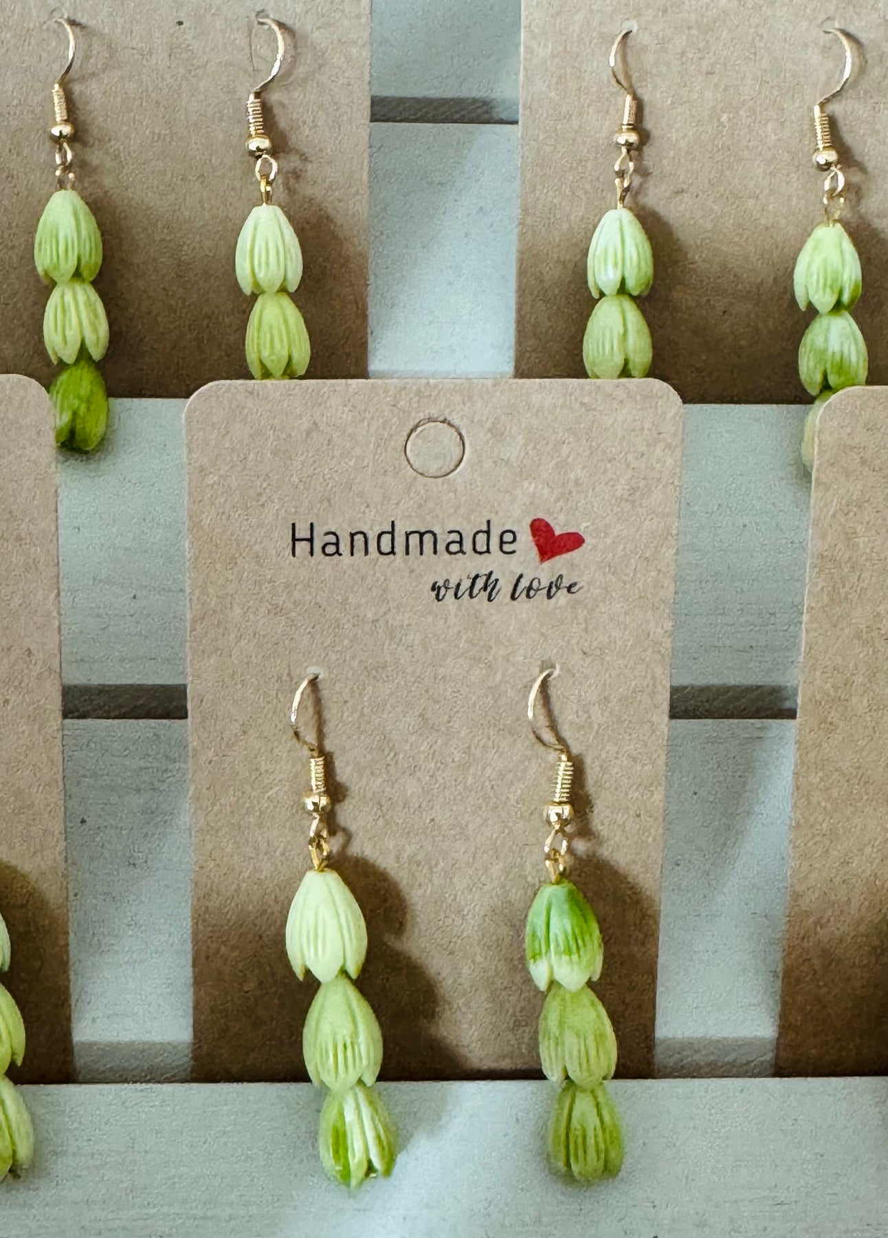 Add a touch of island elegance to your style with our handmade Earrings. Featuring our Triple Drop Pikake Earrings - with three green, purple or cream pikake (jasmine), cascading in a graceful drop design, these earrings evoke the natural beauty and vibrant spirit of the islands. Lightweight and easy to wear, they’re perfect for everyday aloha or a special tropical occasion. Each pair is lovingly made by hand, making them a unique gift or keepsake.
